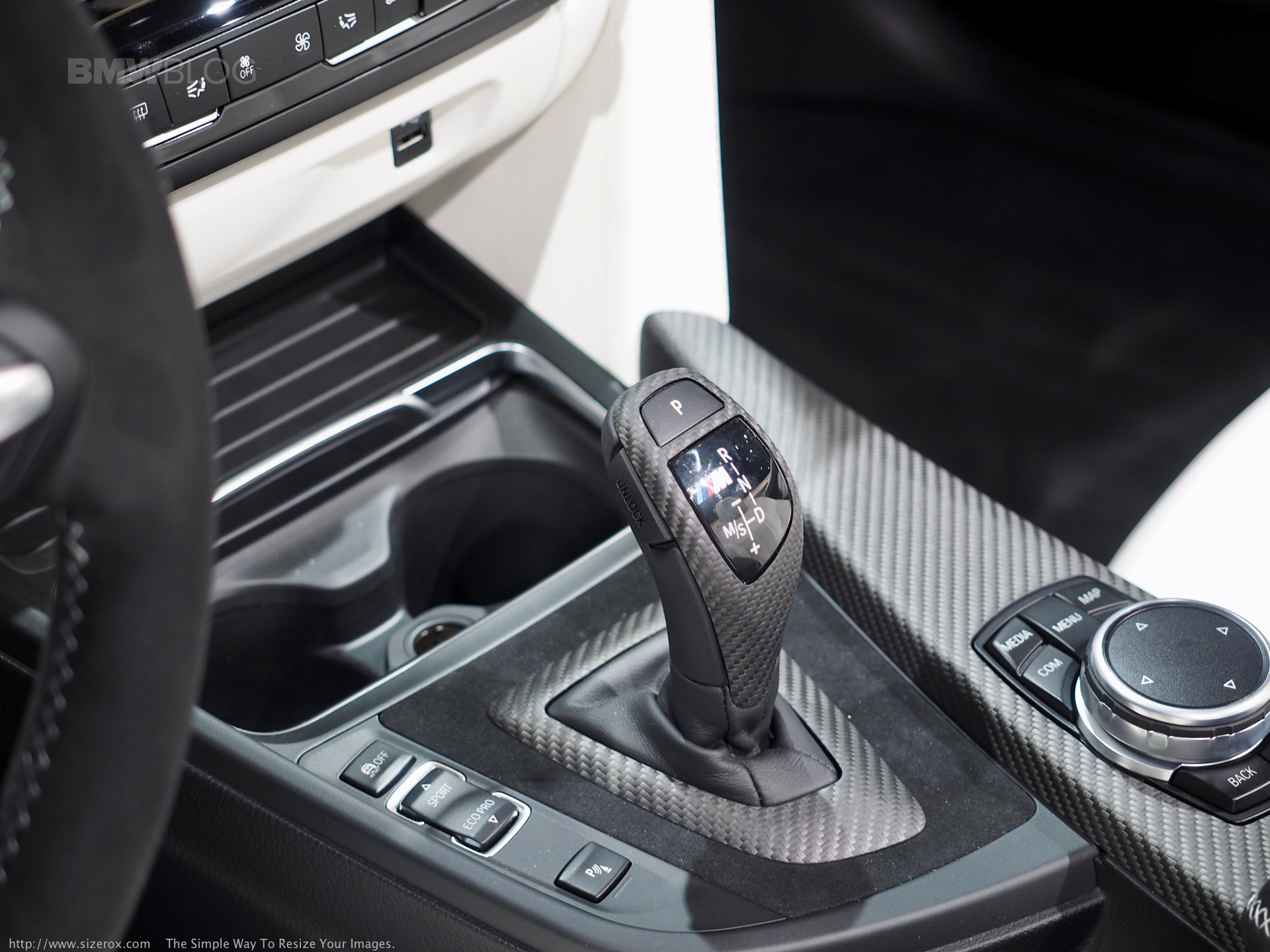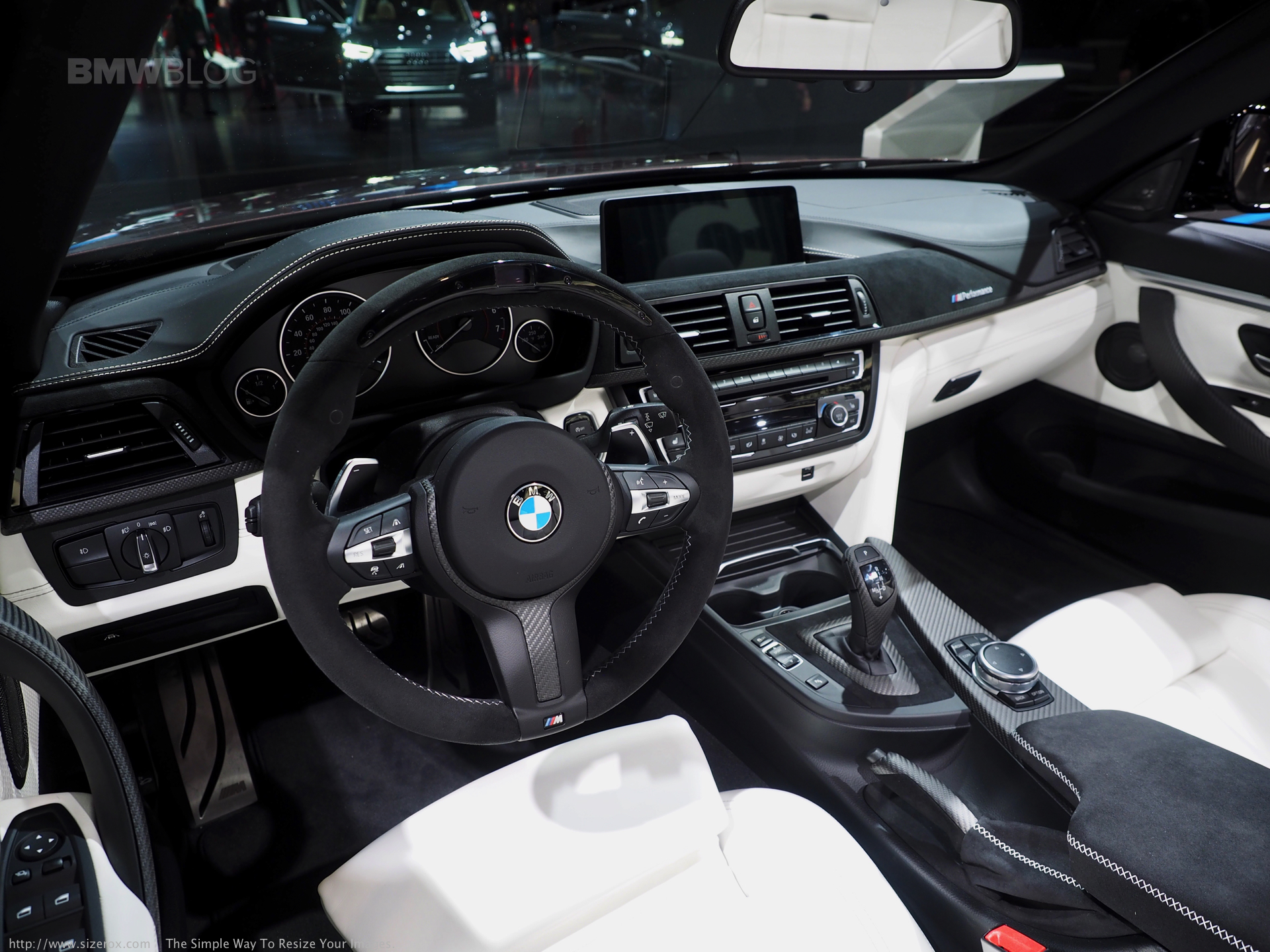 Inside, BMW proudly presents their M Performance Steering Wheel with a digital display and shifting indicators. For the first time, we were able to see live the new center console, “dressed” in alcantara and surrounded by carbon fiber. Things like a carbon fiber DCT shifter and aluminum pedals with the ///M branding are also present.